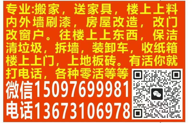 专业搬家,送家具,楼上上料。内外墙刷漆,房屋改造,改门,改窗户。往楼上上东西,保洁,清垃圾,拆墙,装卸车,打孔,有活你就打电话,各种零活等等